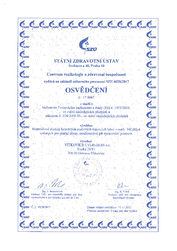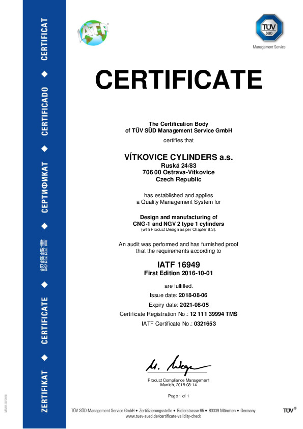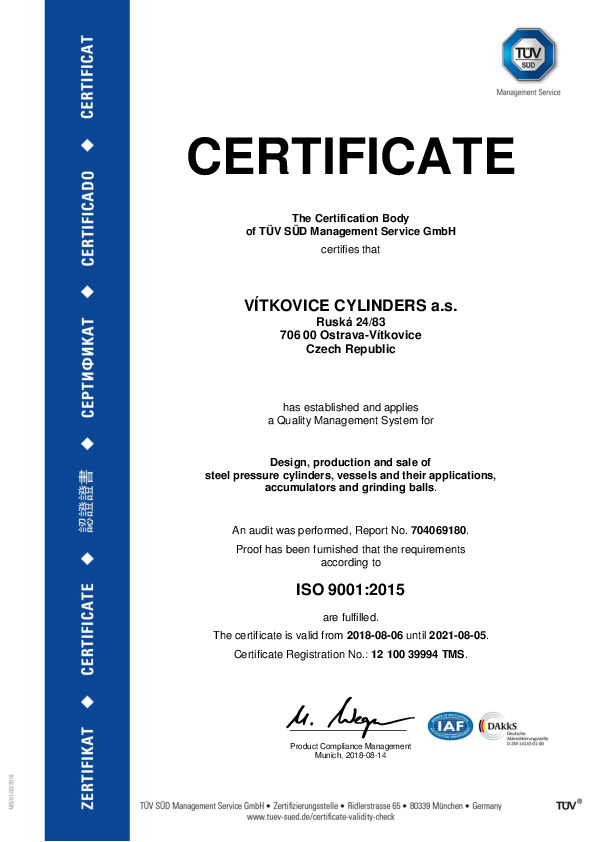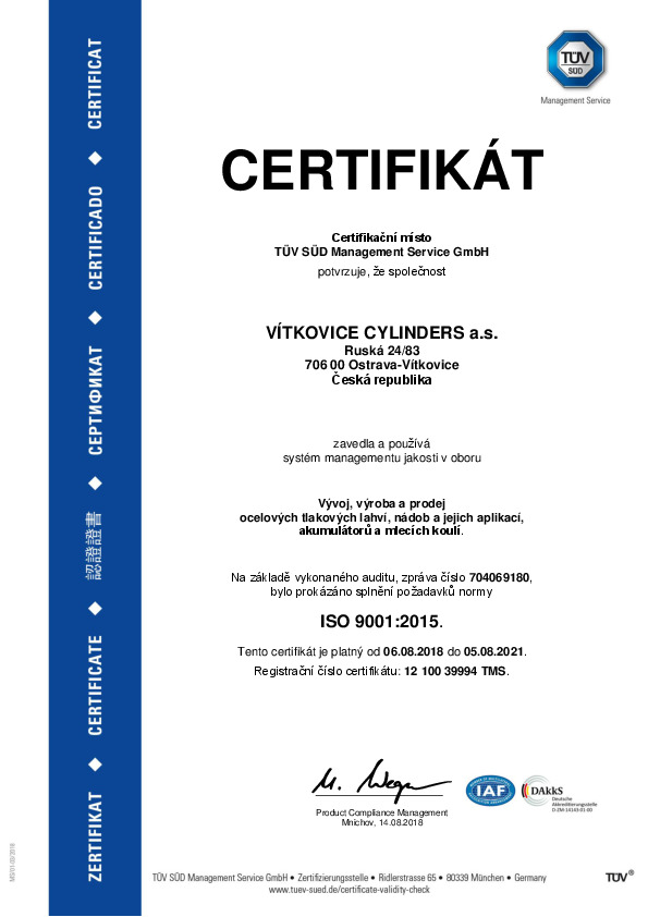 Cylinders Holding - чешская компания, которая выпускает свою продукцию непрерывно на протяжении более 110 лет. Благодаря большому опыту в данной сфере мы разработали близкие к идеалу технологии производства баллонов и резервуаров, которые соответствуют всем европейским и международным стандартам. Процесс контроля всего производственного процесса включает в себя тестирование выпускаемых товаров в независимой лаборатории, что подтверждено соответствующими сертификатами.